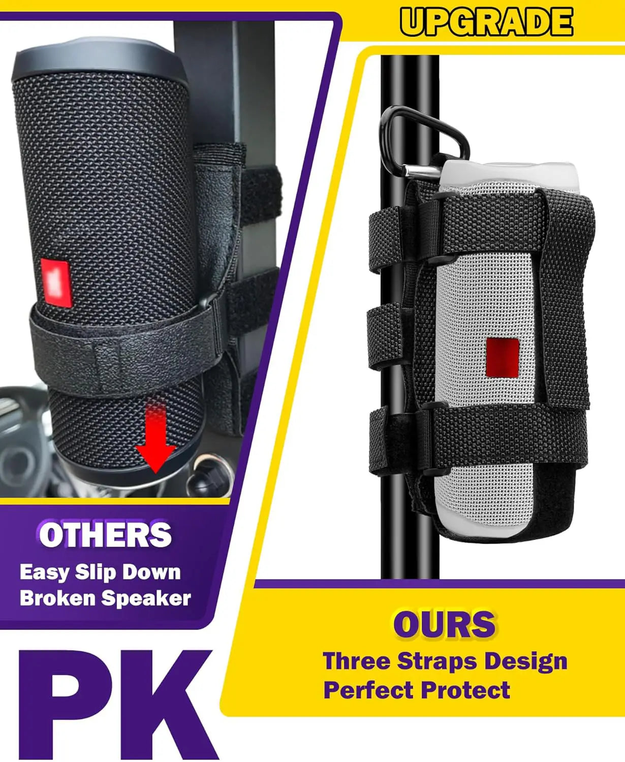 Anti-Slip Protection System: The upgraded speaker mount is made of high quality nylon and non-slip granular material keeps speakers stable even on bumpy roads. Reinforced stitching ensures durability and weight-bearing capacity, It can hold the speaker more firmly. It can withstand more weight and ensure that it is not easy to break and lasts longer than normal stands.