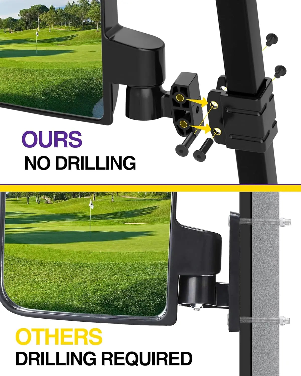 Universal Fit & No Drilling Required: These golf cart mirrors are designed to fit EZGO, Club Car, Yamaha, TXT, RXV, DS, Precedent, G29, and more without the need for drilling. Save time and effort with an easy, tool-free installation that ensures a secure fit on any golf cart model.